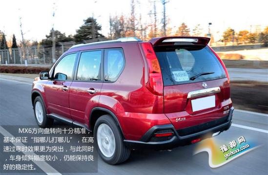 在高速行驶时,MX6的麦弗逊独立前悬以及复合多连杆独立后悬匹配比较默契,并线时的支撑力足够,车身侧倾也比较小。在经过不平路面时,尤其是在高速经过颠簸路面时,车辆依然能保持稳定,同时反馈到座椅的振幅较小,这也整车的舒适性提供帮助。