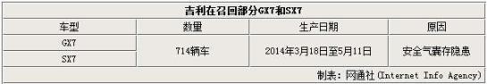 根据质检总局公布的消息,此次召回涉及部分吉利GX7和SX7,其生产日期范围是2014年3月18日至2014年5月11日期间,召回共计714辆车。