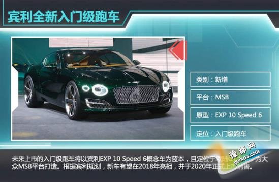 未来上市的入门级跑车将以宾利EXP 10 Speed 6概念车为蓝本,且定位于欧陆GT之下,该车的量产不仅能够丰富宾利产品阵营,还可降低该品牌跑车的购买门槛,利于扩大其销量。根据宾利相关规划,新车有望在2018年亮相,并于2020年正式上市销售。该车将基于大众MSB平台打造。