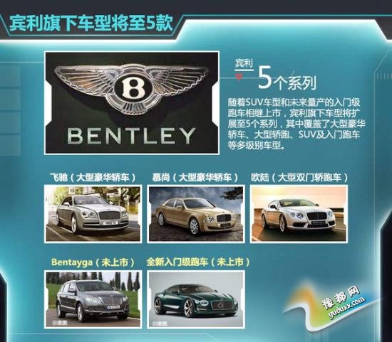 目前宾利旗下的车型有慕尚、飞驰、欧陆系列(包含GT Coupe和GTC敞篷版等车型)3个系列,随着今年宾利首款SUV--Bentayga以及未来宾利全新入门跑车的上市,旗下车型将扩展到5个系列,覆盖了大型豪华轿车、大型轿跑、SUV及入门跑车等多级别车型。