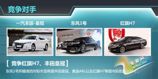 东风1号所瞄准的对标车型将是丰田皇冠、奥迪A6L以及红旗H7等国内知名的公务车。李春荣就此表示,在开发设计之初,东风1号针对国内消费者的需求,定义为具备品位、尊享与睿智的产品,不输于合资品牌。基于神龙公司的生产质量标准,东风1号将拥有国内独一无二的自主高端轿车特质。