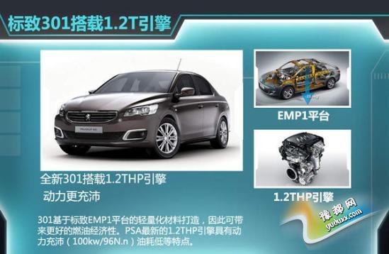 东风标致301是标致首款在华基于EMP1平台打造的车型,该平台所产车型的关键部分零件采用了轻量化材料打造,从而使车辆获得了更好的经济性和性能表现。除了外观方面的升级,东风标致301也会推出动力更强的搭载1.2THP涡轮增压发动机的车型。虽然这是一台三缸发动机,但是却集成了PSA集团众多最新技术,例如小贯量涡轮、缸内支配、全铝机体、DOHC等先进技术,由此这台小排量引擎带来了100kw的最大功率,峰值扭矩也达到了230N.m。
