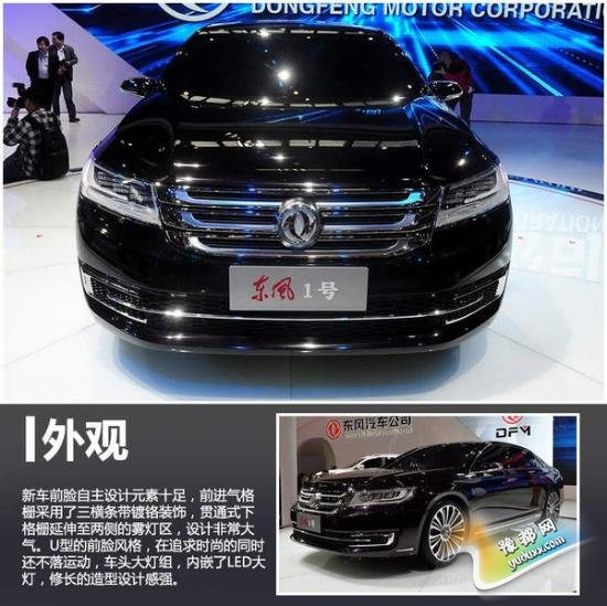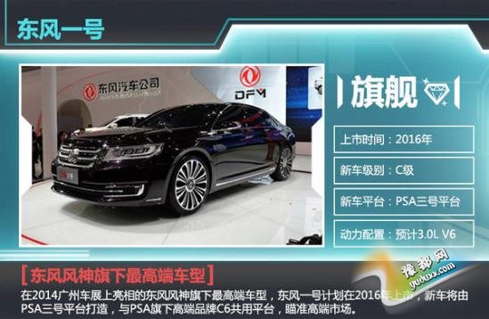 在2014广州车展上亮相的东风风神旗下最高端车型“东风一号”,计划在2016年上市,新车将由PSA三号平台打造,与PSA旗下高端品牌C6共用平台。瞄准高端市场的东风一号长宽高分别为5091mm/1871mm/1463mm,轴距则达到了2950mm,动力方面预计或采用PSA集团的3.0L V6发动机。