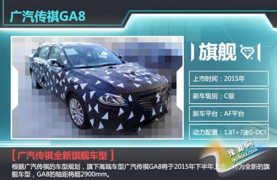 根据广汽传祺的车型规划,旗下高端车型广汽传祺GA8将于2015年下半年上市,作为全新的旗舰车型,GA8的轴距将超2900mm。动力方面官方还未透露,据推测有望与传祺GA6共享动力总成,搭载1.8T涡轮增压引擎,最大功率130KW,峰值扭矩为242N.m,传动方面匹配广汽自主研发的7速G-DCT双离合变速箱。