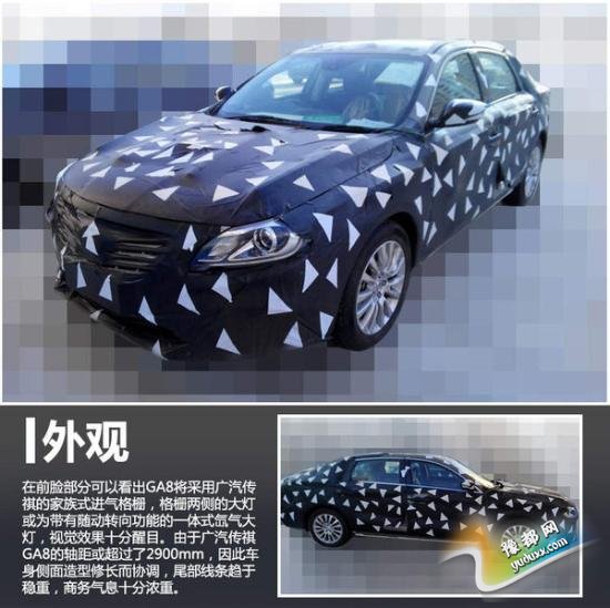 在前脸部分可以看出GA8将采用广汽传祺的家族式进气格栅,格栅两侧的大灯或为带有随动转向功能的一体式氙气大灯,视觉效果十分醒目。由于广汽传祺GA8的轴距或超过了2900mm,因此车身侧面造型修长而协调,多幅轮毂造型视觉感强,尾部线条趋于稳重,商务气息十分浓重。