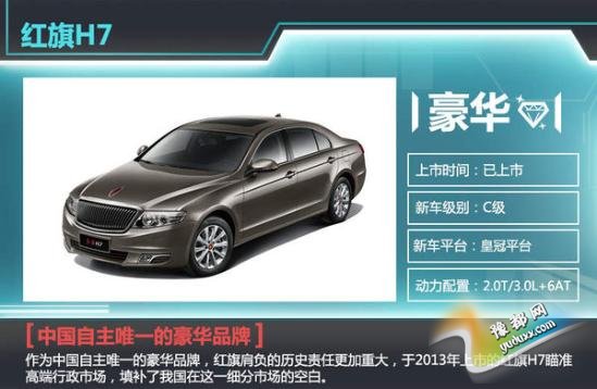 作为中国自主唯一的豪华品牌,红旗肩负的历史责任更加重大,于2013年上市的红旗H7瞄准高端行政市场,填补了我国在这一细分市场的空白。定位C级车的红旗H7,长宽高分别为5095mm/1875mm/1485mm,轴距则达到了2970mm,符合其市场定位,树立起我国自主C级车标杆。