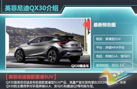 能适时地打造出一款充满竞争力的紧凑型SUV,QX30对于英菲尼迪的重要性不言而喻。值得一提的是,英菲尼迪QX30基于奔驰GLA所采用的MFA平台打造,同时有望搭载梅赛德斯2.0L涡轮增压发动机。需要指出的是,MFA平台是梅赛德斯奔驰特别针对紧凑型车开发的全新技术平台。