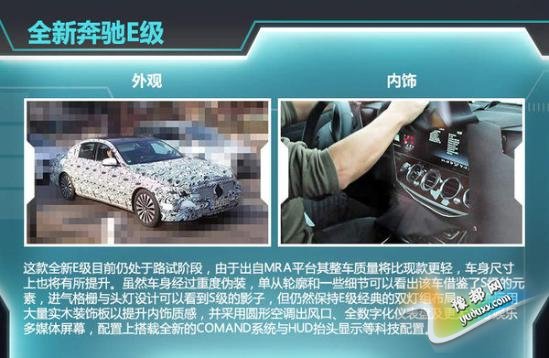 这款全新E级目前仍处于路试阶段,由于出自MRA平台其整车质量将比现款更轻,车身尺寸上也将有所提升。虽然车身经过重度伪装,单从轮廓和一些细节可以看出该车借鉴了S级的元素,进气格栅与头灯设计可以看到S级的影子,但仍然保持E级经典的双灯组布局。内饰运用大量实木装饰板以提升内饰质感,并采用圆形空调出风口、全数字化仪表盘及更大尺寸娱乐多媒体屏幕,配置上搭载全新的COMAND系统与HUD抬头显示等科技配置。