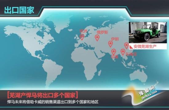 根据卡威汽车的规划,未来生产的悍马纯电动越野车主要出口海外市场,纯电动SUV主要面对国内市场。目前,卡威汽车除了已经推出的皮卡K1外,还会推出首款SUV车型W1。另外,K1的后续产品K2甚至K3也在规划当中。其工厂的年产能为10万台,2014年销售目标2万台。另外,除了国内的销售,卡威汽车的产品还出口日、韩、泰、伊朗、俄罗斯等二十多个国家和地区,2013年卡威K1、W1车型总计有15000台的订单,超过了国内的销售数字,未来卡威悍马电动车的销售,也将会通过卡威在国内与国外的渠道进行销售。
