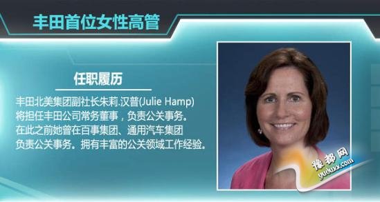 在加入丰田之前,朱莉·汉普(Julie Hamp)曾在百事公司担任高级副总裁兼首席通信官,负责百事公司全球媒体关系,品牌建设管理、行政沟通、消费者关系维护,其在全球人才发展、危机处理等方面拥有十分丰富的公关关系维护经验。同时她也是该公司的执行委员会以及基金会和董事会成员,领导着全球超过350名的公关关系专业团队。