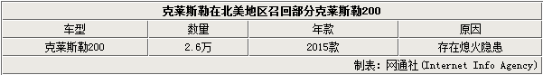 根据NHTSA公布的消息,此次克莱斯勒在北美召回的车型为2015款克莱斯勒200,配备V-6发动机,共涉及2.6万辆。克莱斯勒表示,目前已收到5个客户的投诉,但尚未收到故障引发的相关事故报告,召回将于近期召开。