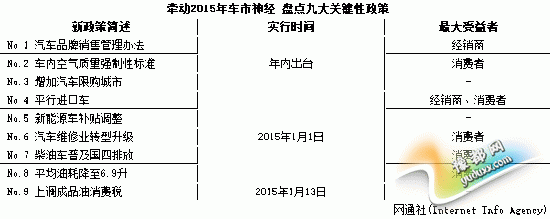 有业内人士预测:2015年中国的汽车市场需求将发生巨大转变,随着更多新政策的刺激,汽车产业也将有进入全新的阶段。在即将跨入农历新年之际,网通社盘点了年内即将出台和已经出台的新政策,这些政策导向都将牵动着国内汽车市场的神经,今天我们也将一一进行解读。