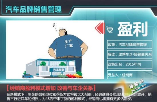 《汽车品牌销售管理办法》的调整有望于年内拨云见日,在新模式下,车企的强势地位和垄断方式将被大大削弱,经销商将会实现品牌授权的放开、销售平行进口车的资质,为4S店带来了新的盈利模式,经销商也将拥有更多话语权。