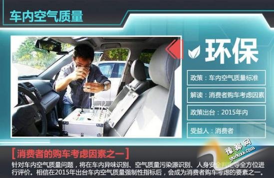 如何解决车内空气质量,保证乘客和驾驶者的身体健康,目前国家环保部针对现有《乘用车内空气质量评价指南》进行修改和完善,并将于年内出台车内空气质量的强制性标准。据了解,针对车内空气质量问题,将在车内异味识别、空气质量污染源识别、人身安全判定等全方位进行评价。相信在2015年出台车内空气质量强制性指标后,会成为消费者购车考虑的要素之一。