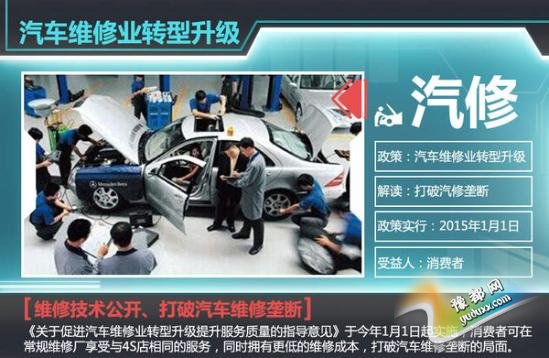 为改进国内汽车维修市场发展不规范,消费不透明、机构凌乱等问题,2014年9月3日出台了《关于促进汽车维修业转型升级提升服务质量的指导意见》,并于今年1月1日起正式实施。年内消费者可在常规维修厂享受与4S店相同的服务,同时拥有更低的维修成本,打破汽车维修垄断的局面。汽车生产及授权销售、维修企业不得以“汽车在三包期限内选择非授权点进行维修服务”为由,拒绝为消费者提供维修服务。除此之外,在年内上市的所有新车必须公开维修资料,同时授权配件经销商允许向终端用户销售原厂配件。