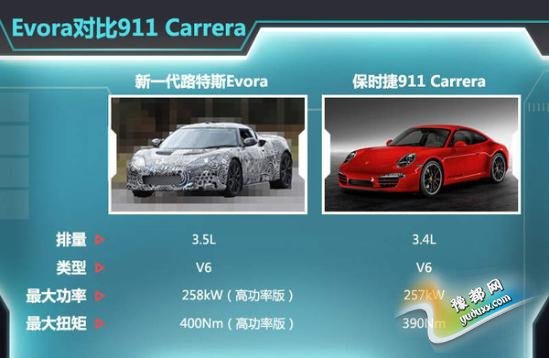 排量为3.5L的全新路特斯Evora与保时捷911 Carrera在动力上旗鼓相当,其搭载的3.5L V6引擎分为高低功率版本。低功率版最大功率为206kW,峰值扭矩为350Nm,而高功率版最大功率和峰值扭矩分别为258kW和400Nm,在动力参数方面均略高于911 Carrera。