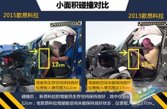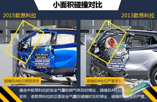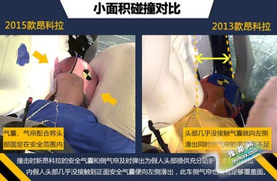 参加碰撞测试的别克昂科拉均为美版车型。在最为严苛的小面积碰撞测试中,2015款昂科拉的总评以及各乘员安全项均拿到了最高评价“G”(良好),在碰撞中车辆为车内乘员提供了全面到位的保护。而2013款昂科拉小面积总评只拿到最低级的“P”(较差),碰撞后根据数据读数显示,模拟驾驶员假人左侧膝部和小腿有受到较严重伤害风险,左侧大腿也有受伤风险。不过,无论新老款昂科拉,在正面40%碰撞、侧面碰撞、顶部碰撞和颈部保护这4大项考核中的成绩均为良好。(注:在美国参加测试车型的最终碰撞成绩仅供国内消费者参考)