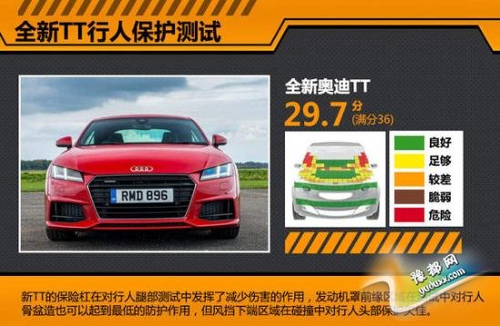 全新TT在行人保护测试环节获得较为理想的成绩,测试车型装备了“主动式行人保护发动机罩系统”,当车辆与行人发生碰撞时,发动机罩会上扬,与内部坚硬部件形成缓冲空间,这样可使行人头部接触发动机罩表面时减小伤害。因此在行人头部安全单项测试中此车得分较高,为17.7分。此车的保险杠在对行人腿部测试中发挥了减少伤害的作用,行人腿部单项测试成绩拿到6分满分。发动机罩前缘区域在测试中对行人骨盆造也可以起到最低的防护作用,因此骨盆保护单项测试也拿到6分满分,但风挡下端区域在碰撞中对行人头部保护欠佳。行人保护大项测试满分36分,新TT拿到了29.7分。