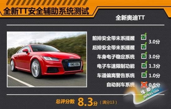 在车辆辅助安全测试中,新TT的车身稳定系统、前后安全带未系提醒系统都是标准装备,全部通过的考核并获得加分。车速限制系统虽然是选装装备,但E-NCAP预测此车的大多数车型会配备该系统,因此通过评估和获得加分。车道偏离警示系统虽然也是选装配置,但通过评估获得加分。自动刹车系统在测试车上并未提供,因此没有通过考核。