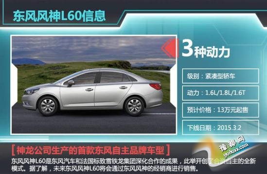 东风集团在去年3月强势入股PSA,根据当时双方商定,神龙公司未来将生产除东风标致、东风雪铁龙之外的东风自主品牌车型。随后在2014年北京车展期间,东风风神展出了一款名为“L60”的概念车。对于这款新车,神龙公司总经理邱现东表示:“东风风神L60是神龙公司生产的第一款东风自主品牌车型,开创了合资公司自主全新模式。”