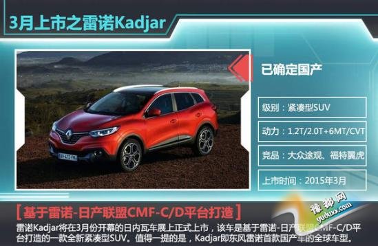 继科雷傲和Captur之后,雷诺SUV家族将再添一员猛将,全新SUV车型Kadjar将在3月份开幕的日内瓦车展正式上市。据了解,该车是基于雷诺-日产联盟CMF-C/D平台打造的一款全新紧凑型SUV,同时其也是东风雷诺首款国产车的全球车型。