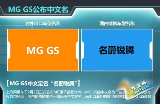 去年年底时,上汽首次发布了MG品牌首款SUV车型的官图,紧接着,该车也被上汽冠以“MG GS”的定名。考虑到纯英文名称可能不利于后期的市场推广,所以有个合适的中文名就显得格外重要了。日前,网通社从上汽乘用车官方获悉:MG GS中文名正式定为“名爵锐腾”,这款SUV将会在今年4月发布上市。虽然名字可能听起来还暂时有些拗口,但相信随着更加深入的宣传,名爵锐腾这四个字会被更多消费者所熟知。
