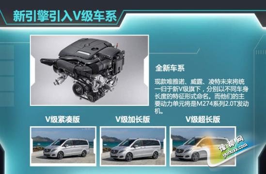 北京奔驰发动机工厂所生产的引擎主要为国产奔驰车型提供动力单元,新一代V级在华投产后将以汽油发动机为主,因此福建奔驰有望向北京奔驰采购发动机用于新一代V级车型之上。奔驰推出的新一代V级拥有两种车身轴距尺寸,一款轴距为3,200mm,与现款唯雅诺保持一致,该车定位于6座、7座行政级别MPV。另一款可以称之为长轴版车型,该车轴距达到3,430mm,与现款威霆轴距相同,而该车则同样采用了四排9座的设计。也就是说,奔驰全新一代V级的两个轴距版本,将分别替代现款唯雅诺与威霆车型。