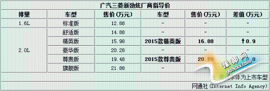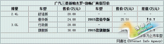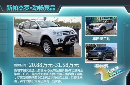 广汽三菱一直致力于SUV车型的发展,凭借旗下劲炫ASX以及帕杰罗劲畅两款车型,2014年全年销量同比增长46.8%,增长速度在日系合资车企中位居第二,即便如此,广汽三菱并没有停下脚步,而是选择对旗下产品线进行升级,以便在竞争激烈的SUV市场中“稳扎稳打”。日前,网通社从广汽三菱官方获悉:新劲炫2.0L 2015款精英版、尊贵版以及新帕杰罗劲畅3.0L 2015款豪华版、旗舰版共四款车型正式上市,其中新劲炫2.0L 2015款精英版售价为16.88万元、2.0L 2015款精英版售价为20.28万元,售价较老款车型分别上调0.9万、0.8万元;新帕杰罗劲畅3.0L 2015款豪华版售价为25.58万元,新帕杰罗劲畅3.0L 2015款旗舰版售价为31.58万元,售价较老款车型均提升0.7万元。