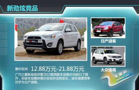 广汽三菱2015款新劲炫两款车型均是2.0L中配以及高配车型,但其售价区间并未进行调整,由于在外观、内饰以及配置方面的提升,其消费群体将有望因此而扩大,同时与日产逍客、大众途观等竞品相比,新劲炫在售价方面显然更具吸引力。