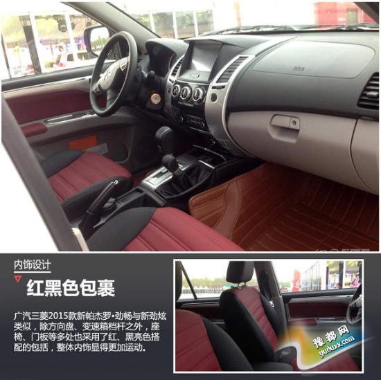 此外,广汽三菱2015款新帕杰罗劲畅两款车型的座椅、门板也采用了红色包裹,看起来质感也有所提升,但该车方向盘和变速箱档杆等除依然沿用的是老款车型的风格,不过有了这些红、黑亮色搭配点缀之后,整体内饰显得更加运动。