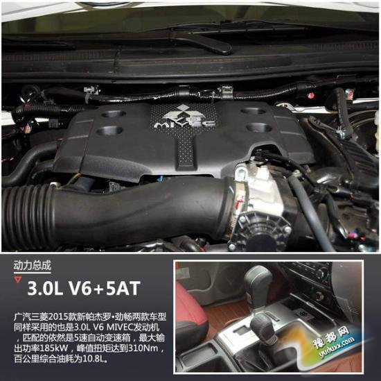 广汽三菱2015款新帕杰罗劲畅两款车型仍然采用的是3.0L V6自然吸气发动机,最大功率为185kW,最大扭矩达到310Nm,与之匹配的是5档自动变速箱,百公里综合油耗仅为10.8L。不过该车中配车型-豪华版采用的是前置后驱的形式,而顶配版-旗舰版则采用的是前置四驱。