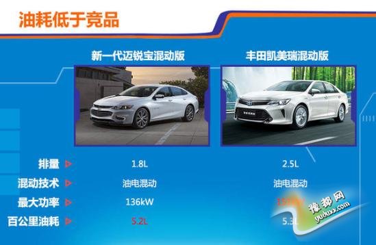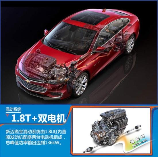 除了传统动力外,雪佛兰还为迈锐宝准备了一套混合动力系统。该系统使用1.8L缸内直喷直列四缸发动机配搭两台电动机,整套系统的峰值功率输出达到136kW。配备容量为1.5kWh的锂离子电池组,纯电动模式下的极速达到88km/h。这套混合动力系统还配有制动能量回收系统,以及被称为EGHR的排气温度回收系统,EGHR被用于发动机预热和座舱制热。新车混动系统的百公里综合油耗为5.2L,比已上市的丰田凯美瑞混动车型油耗略低,但最大功率低于对手。(网通社 2015年4月3日 北京报道)