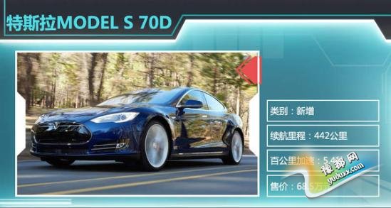特斯拉MODEL S 70D的定位在MODEL S60和S85两款车型之间,从MODEL S 70D的名称来看,“70”代表新车拥有70千瓦时(kWh)的电池组,而“D”则代表全轮驱动的入门级版本。特斯拉MODEL S 70D采用双电机全轮驱动技术,可独立数字控制前轴和后轴,这种设计让扭矩均匀分配到四个车轮,使得整车的牵引力、稳定性、操控性都有相应提升。新车的电机最大功率245kW,百公里加速时间为5.4秒,最高时速225公里,续航里程可达442公里。特斯拉MODEL S 70D在华售价为68.5万元,已开始接受预定。