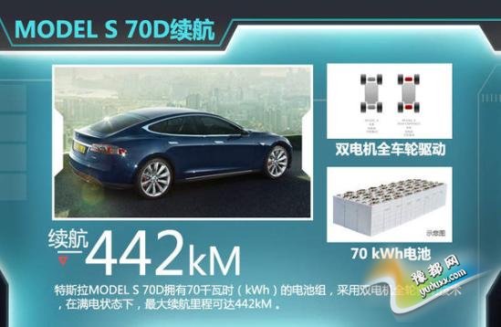 有新能源汽车行业之“苹果”美誉的特斯拉全球销售占比中,亚太市场约占40%,而这其中大部分销量来自中国市场。特斯拉在华推出首款轿跑车—Model S后,将进一步扩大该产品线阵容。日前网通社从特斯拉官方获悉,特斯拉将推出入门级新车-- MODEL S 70D,该车定位低于略高于MODEL S 60系列,新车的续航里程将达到442公里,最高时速可达225km/h,目前已接受消费者预定。