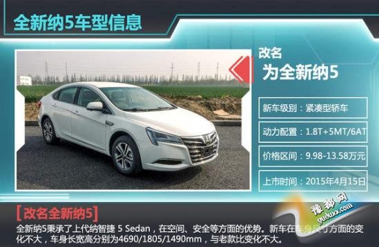 在过去一年中,东风裕隆重点布局了旗下SUV和MPV产品线,而作为纳智捷品牌唯一的轿车车型,纳智捷5 Sedan也将于今年迎来改款。日前,网通社从东风裕隆官方获悉:纳智捷紧凑型车全新纳5将于4月15日正式上市,新车预售价格区间为9.98-13.58万元。值得一提的是,全新纳5将会用1.8T发动机取代现款车型的2.0T动力。