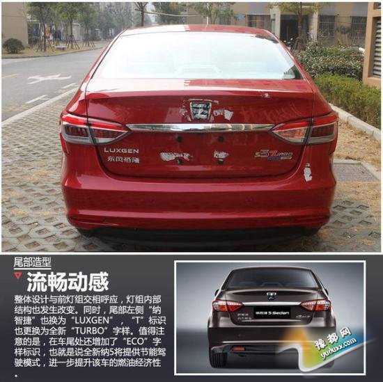 在尾部方面,新车同样在灯组造型上进行调整,整体设计与前灯组交相呼应,灯组内部结构也发生改变。同时,尾部左侧“纳智捷”也换为“LUXGEN”,“T”标识也更换为全新“TURBO”字样。值得注意的是,在车尾处还增加了“ECO”字样标识,也就是说全新纳5将提供节能驾驶模式,进一步提升该车的燃油经济性。
