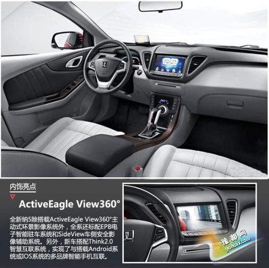 内饰方面,新车的用料和做工得到提升,并更多的使用软性材质,同时仪表盘、方向盘等细节设计有所调整。配置方面,全新纳5除搭载ActiveEagle View360°主动式环景影像系统外,全系还标配EPB电子智能驻车系统和SideView车侧安全影像辅助系统。另外,新车搭配Think2.0智慧互联系统,实现了与搭载Android系统或IOS系统的多品牌智能手机互联,其包括影音娱乐、电话通讯、行车安全、系统设定、手机互联互控五大功能。