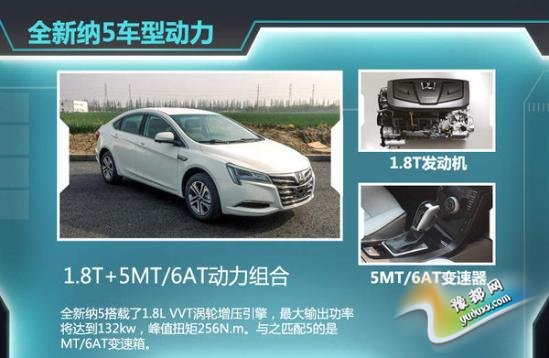 全新纳5搭载了1.8L VVT涡轮增压引擎,最大输出功率将达到132kw,峰值扭矩256N.m。其具有低转速、高扭力的特性,能够随时提供充沛的动力输出,发动机匹配5MT/6AT变速箱,现款车型使用的2.0T发动机则被淘汰。