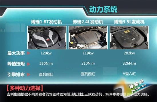 吉利博瑞的动力方面拥有三款引擎,包括1.8T涡轮增压引擎和3.5L V6引擎以及2.4L自然吸气发动机,1.8T引擎排布为直列四缸,后者为V型六缸。三款引擎最大功率分别为120kW、202kW、119kW;峰值扭矩分别为250Nm、326Nm、210Nm,两款车都搭配6速手自一体变速箱。多样的动力选择为消费者提供更丰富的选择余地。