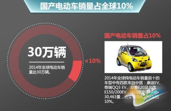 纯电动车在2012年与2013年全球市场增长相对缓慢,进入2014年后实现了高速增长,全年销量达30万辆,而中国电动车市场随着政策的扶持及消费者的逐渐认可,电动车销量增长很快。近日,网通社对2014年全球销量前十名的纯电动车型进行了盘点,排名前三的分别为日产聆风、特斯拉Model S及宝马i3,其中日产聆风以6.1万辆高居榜首。值得一提的是,国产纯电动车中有四款销量进入到前十,足见中国新能源汽车市场的突飞猛进。