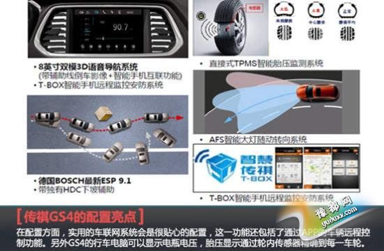 在配置方面,实用的车联网系统会是很贴心的配置,这一功能还包括了通过APP的车辆远程控制功能。另外GS4的行车电脑可以显示电瓶电压,胎压显示也是通过轮内传感器精确到每一车轮。