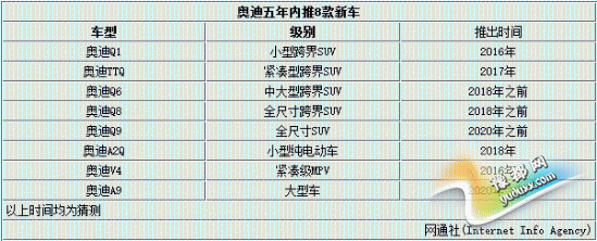 德系三大豪华品牌在全球的竞争进入白热化,不断通过研发新车型、推出新能源车型补齐产品线的空缺。其中奥迪在2014年的年度股东大会上提出了“2020战略”,计划将目前的产品序列又52款扩充至60款。近日,网通社盘点了奥迪即将推出的8款车型,其中有望包括5款SUV车型以及一款新能源小型车。除此之外,还将推出旗舰级轿车A9以及MPV车型V4。新车上市后,奥迪的SUV车型形成一条完整的产品线。