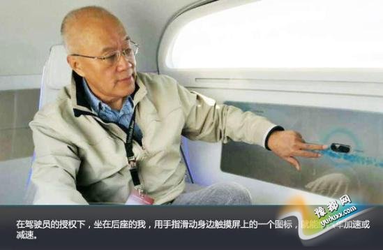驾驶员把座椅180°向后转,把方向盘留在脑后,自顾自地和后排的我们在宽敞的车厢里聊天,听任汽车自行驶出车位,依托前后左右远近6个摄像头的反馈,按照设定的目的地,自行前进、并线、转弯甚至主动避让行人。车厢内三面都是大块触摸屏,乘客可以通过触摸、手势和眼神实现与车、互联网和车外世界的交流,甚至用一片美丽大自然的影像替代窗外繁杂的街景。在驾驶员的授权下,坐在后座的我,用手指滑动身边触摸屏上的一个图标,就能给汽车加速或减速。