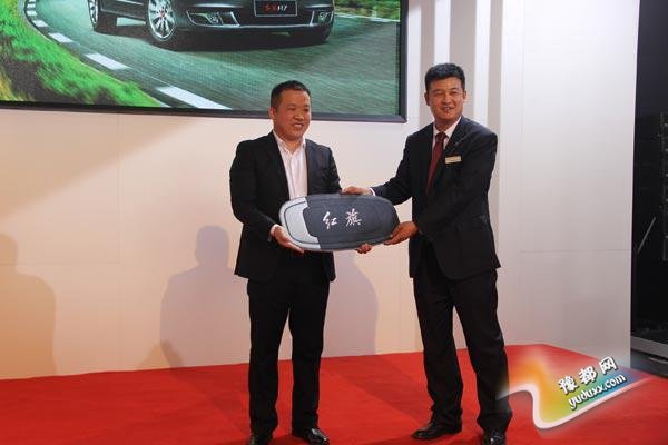 郑州大展红旗销售总监管潇斐先生为红旗H71.8T首位车主吴广华先生颁发了车型钥匙