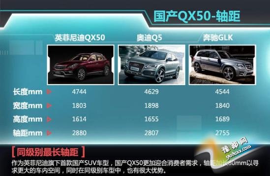在英菲尼迪国产QX50同级别车型中,奥迪Q5以及奔驰GLK等豪华品牌中型SUV由于率先国产,在该细分市场中拥有很强的竞争力,这不仅仅来源于品牌认可度,更多的是来自于自身的产品实力,不过在车身尺寸上,英菲尼迪国产QX50凭借2880mm的轴距长度成为同级别车型“领头羊”,这也直接提升了车内空间。