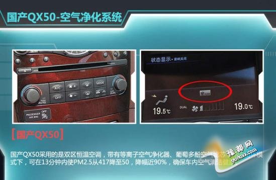 对于空气中PM2.5值经常爆表的情况而言,英菲尼迪针对国产QX50的双区恒温空调基础上增加的等离子空气净化器、葡萄多酚空气滤芯可有效解决这一问题,该套空调系统提供车内外空气循环模式。其中葡萄多酚空气滤芯相比普通滤芯,去除可吸入颗粒物的速度更快、效果更好,在内循环模式下,可在13分钟内使PM2.5从417降至50,降幅近90%,为车内乘坐人员提供更佳的空气质量。