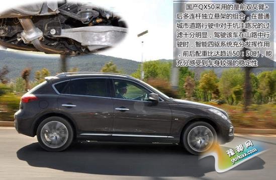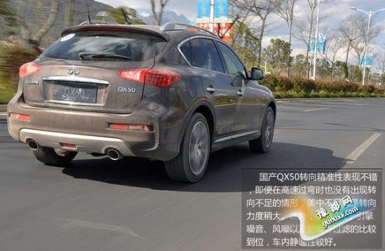 总结: 通过上述六大亮点的说明,英菲尼迪国产QX50挑战Q5、GLK等车型有了更大的底气,首先得益于外观、内饰的调整,使得新车有了“面子”,同时标配智能四驱系统,采用富有科技感的全景式监控影像系统之后,国产QX50的“里子”也得以大幅提升。不得不提到的是,国产QX50还在同级别车型中拥有更低的购车以及用车成本,在竞争愈加激烈的豪华品牌SUV市场,未来国产QX50市场表现如何,令人期待。(网通社 2015年3月18日 丽江报道)