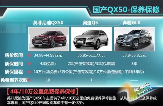 从购车成本来看,英菲尼迪国产QX50凭借34.98-44.98万元的售价区间相对于Q5以及GLK两款车型而言有一定优势,不仅如此,在售后服务方面,英菲尼迪国产QX50也体现出足够的诚意。在国产豪华车品牌中,东风英菲尼迪是唯一提供4年/10万公里免费保修保养的品牌,根据英菲尼迪官方公布的保养里程,国产QX50在此期间可以节约10次的保养及保修费用,降低了用车成本。