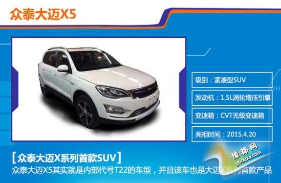 目前众泰品牌旗下共有T600、T200两款SUV车型,即将加入的大迈X5又将继续丰富其产品阵容。众泰大迈X5其实就是此前曝光内部代号为T22的车型,并且该车也是全新大迈X系列的首款车型,该系列取意稳步进去、跨越发展,也同“大卖”谐音,由此可见众泰对该车的期望相当高。
