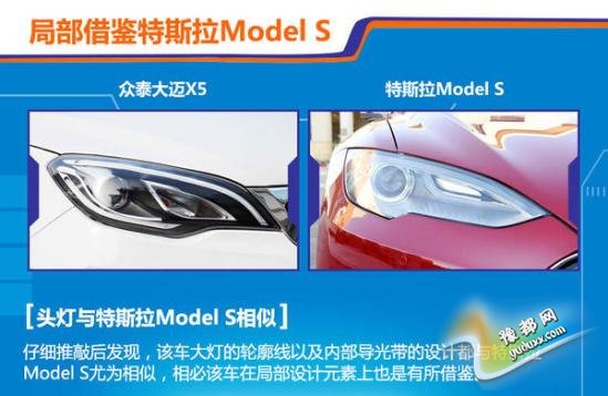 作为大迈X系列的首款产品,该车给人第一印象就是干净利落,大量的镀铬材质把车头部分修饰的层次分明。该车前大灯造型较为抢眼,外侧轮廓与车身线条相互交融整体感强,同时车灯内部还用镀铬材质进行装饰,视觉效果突出。虽然众泰大迈X5的外观设计原创度较高,与众泰旗下车型相比,进步明显。但仔细推敲后发现,该车大灯的轮廓线以及内部导光带的设计都与特斯拉Model S尤为相似,相必该车在局部设计元素上也是有所借鉴。